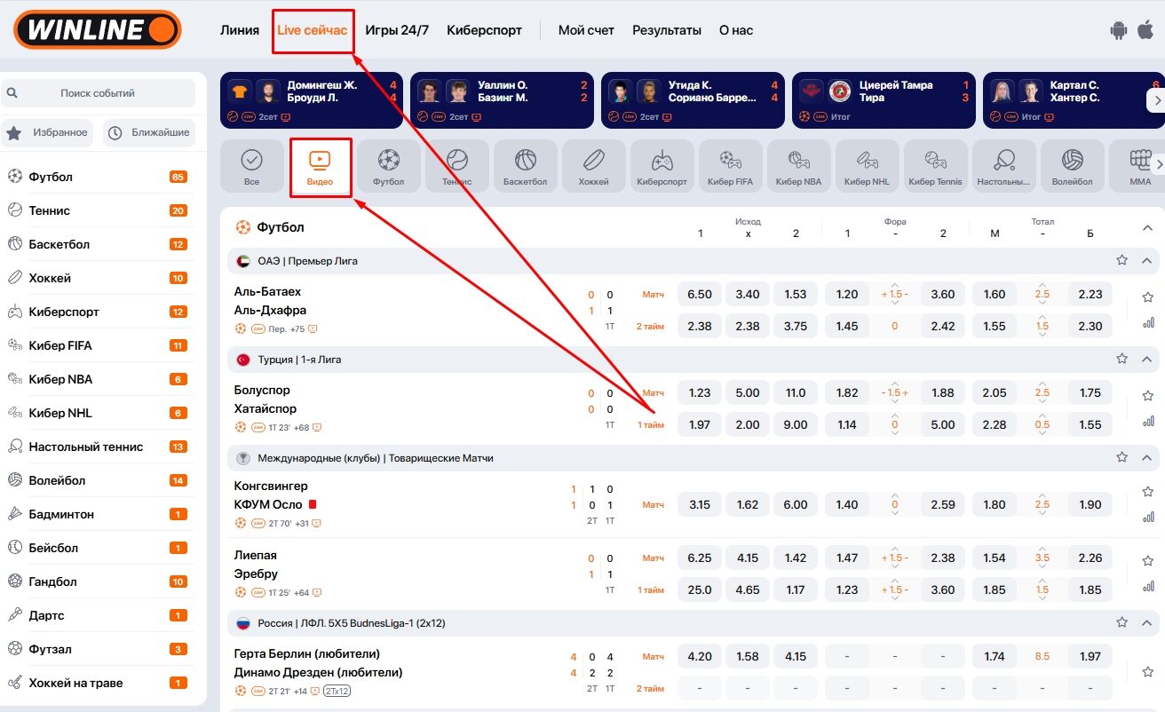 Все доступные трансляции на платформе букмекерской компании представлены в разделе «Live». Матчи, для которых организован прямой эфир, отмечены специальным значком видео в общем списке событий.