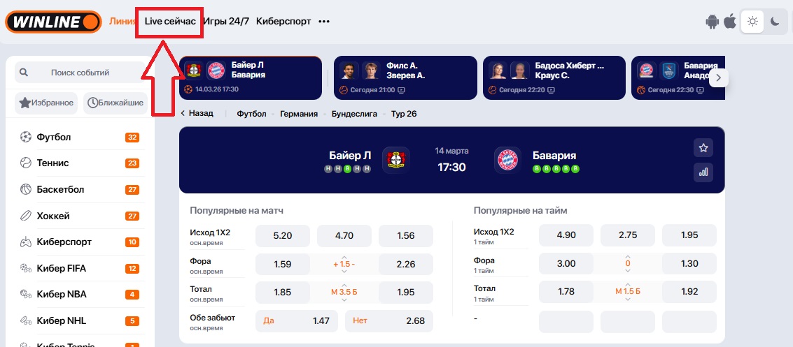 В приложениях и на сайтах БК все игры с прямым эфиром собирают в разделе Live. События с видеотрансляцией помечают значком «Play» или «Видео».
