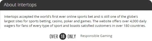 Букмекерская контора Intertops начала свою деятельность в Великобритании в 1983 году. Изначально желающие имели возможность ставить только по телефону, однако уже в 90-х компания вышла на новый уровень, став одним из первооткрывателей в мире беттинга через Интернет.