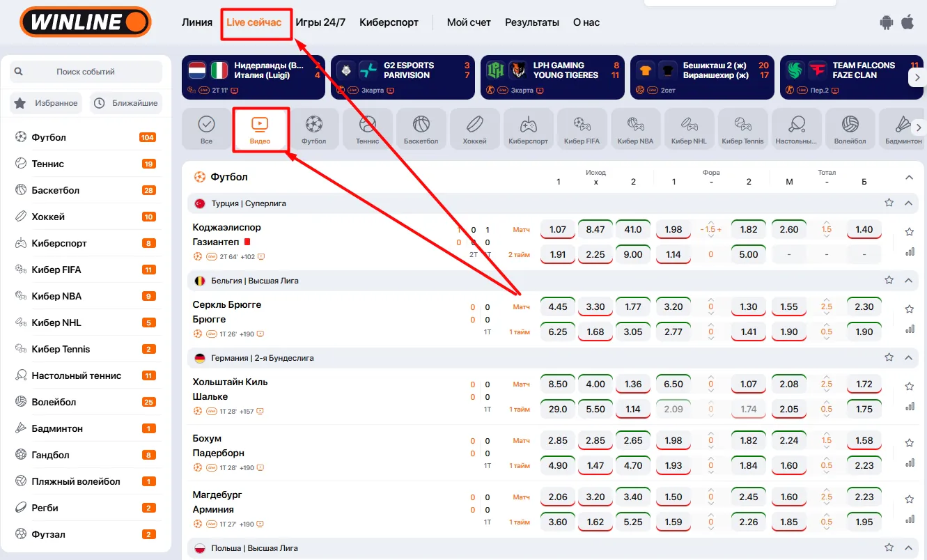 Все доступные трансляции на платформе букмекерской компании можно найти в разделе Live. Матчи, для которых организован прямой эфир, отмечены специальным значком видео.