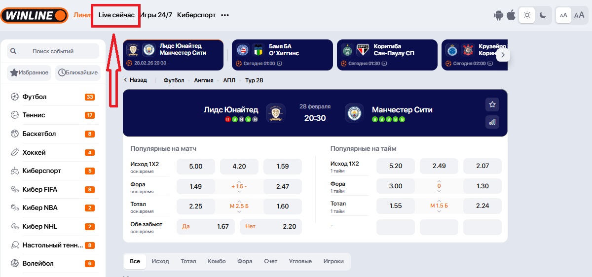 В приложениях и на сайтах БК все игры с прямым эфиром собирают в разделе Live. События с видеотрансляцией помечают значком «Play» или «Видео».