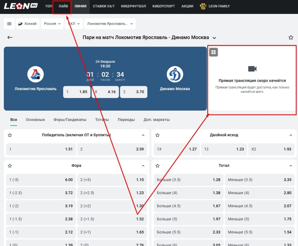 Матч регулярного первенства КХЛ «Локомотив» – «Динамо» М. пройдет в Ярославле на льду «Арены-200». Игру в прямом эфире покажут телеканал «Матч ТВ» и онлайн-кинотеатр «Кинопоиск». Бесплатная трансляция для всех зарегистрированных пользователей также будет доступна на сайте и в мобильном приложении БК «Леон» в разделе «Лайв». Для запуска видео необходимо войти в личный кабинет, перейти в карточку матча и нажать на кнопку в виде экрана.