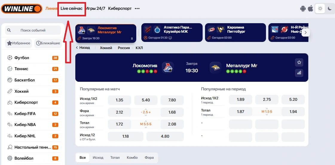 В приложениях и на сайтах БК все игры с прямым эфиром собирают в разделе Live. События с видеотрансляцией помечают значком «Play» или «Видео».