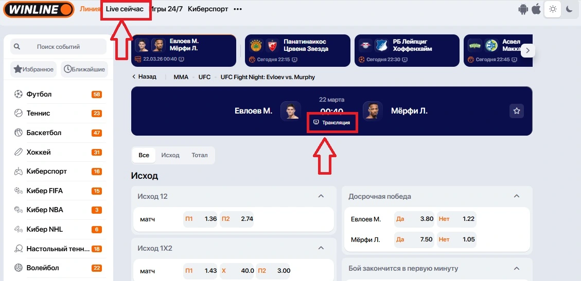 В приложениях и на сайтах БК все игры с прямым эфиром собирают в разделе Live. События с видеотрансляцией помечают значком «Play» или «Видео».