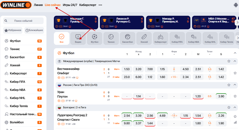 В приложениях и на сайтах букмекеров все матчи с прямым эфиром собирают в разделе Live. События с видеотрансляцией обычно помечают значком «Play» или «Видео».