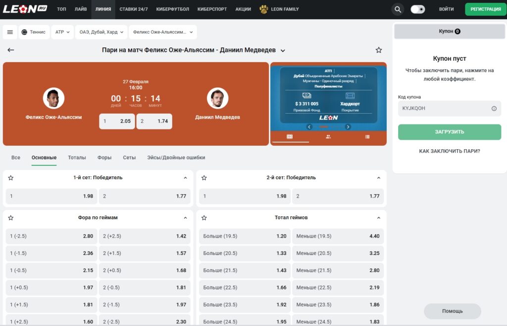 Коэффициенты на матч Оже-Альяссим – Медведев