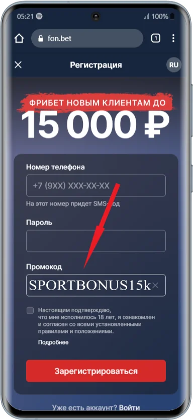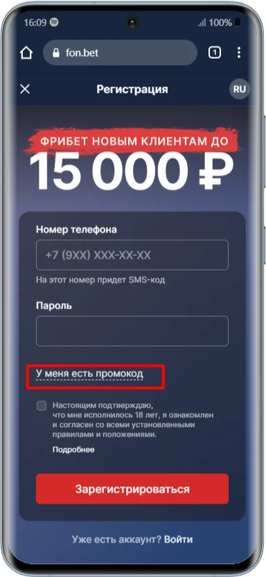 Активировать промокод Фонбет можно в мобильном приложении или мобильной версии, если нет возможность зайти на официальный сайт с ПК. Для этого достаточно запустить софт и ввести промокод в соответствующее поле при регистрации или в личном кабинете.