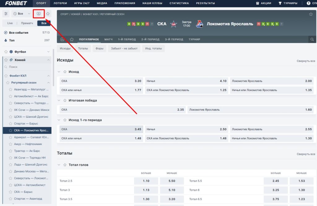 - на платформе букмекерской компании «Фонбет» (после регистрации и входа в аккаунт);
