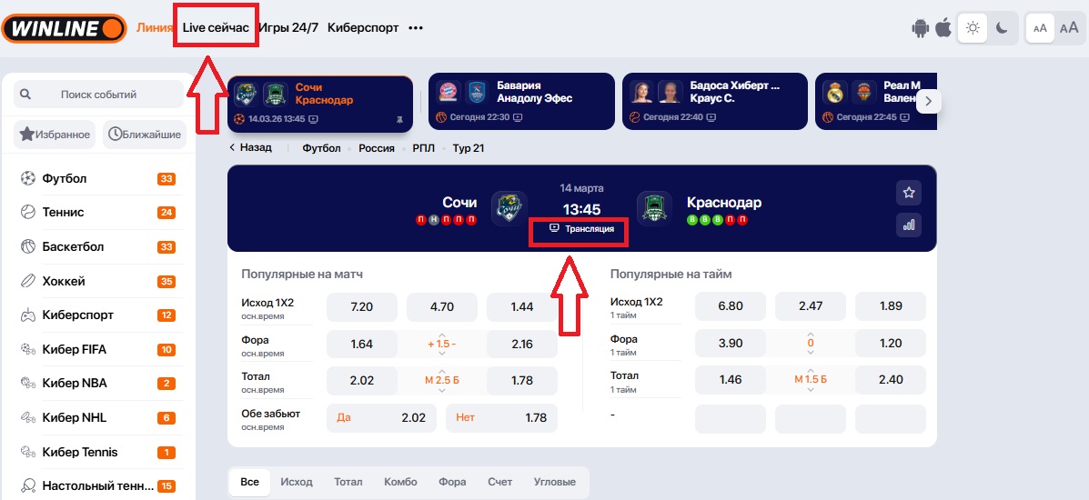 В приложениях и на сайтах БК все игры с прямым эфиром собирают в разделе Live. События с видеотрансляцией помечают значком «Play» или «Видео».