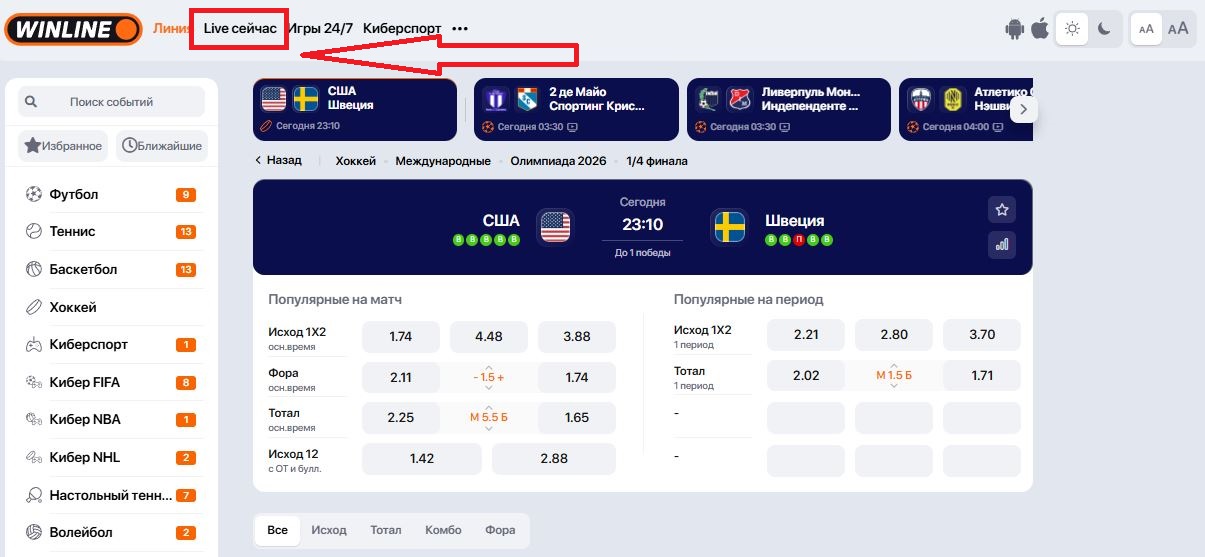 В приложениях и на сайтах букмекеров все матчи с прямым эфиром собирают в разделе Live. События с видеотрансляцией помечают значком «Play» или «Видео».
