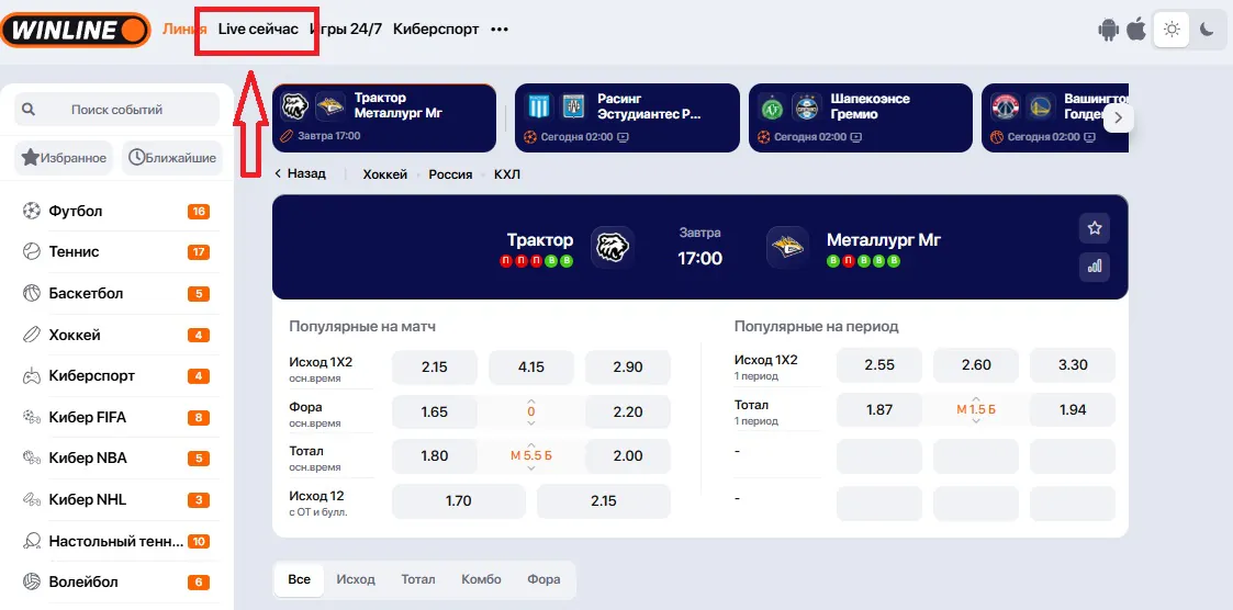 В приложениях и на сайтах БК все игры с прямым эфиром собирают в разделе Live. События с видеотрансляцией помечают значком «Play» или «Видео».
