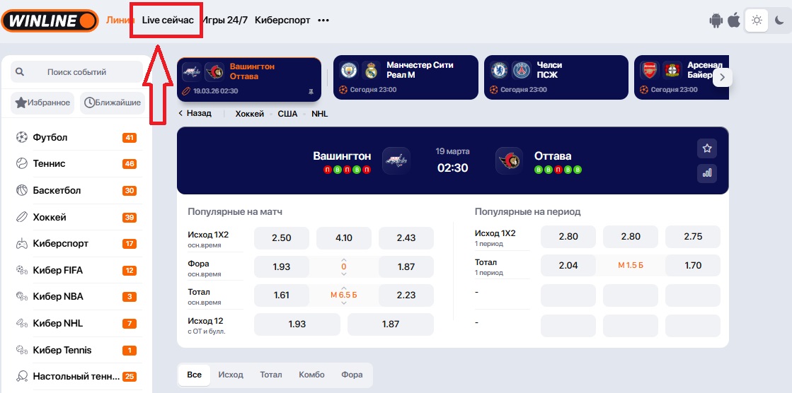 В приложениях и на сайтах БК все игры с прямым эфиром собирают в разделе Live. События с видеотрансляцией помечают значком «Play» или «Видео».